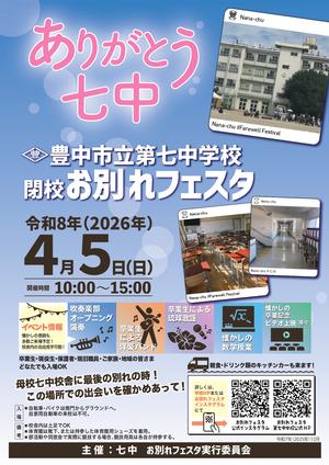 私たちは、校舎で迎える最後の一日として「豊中市立第七中学校 閉校 お別れフェスタ」を次のように開催いたします。