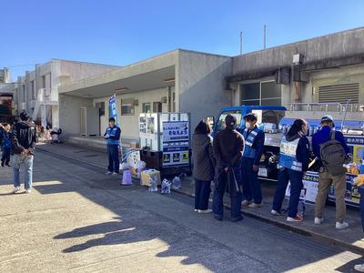 能登半島地震で活躍した上下水道局の給水車の展示コーナー。