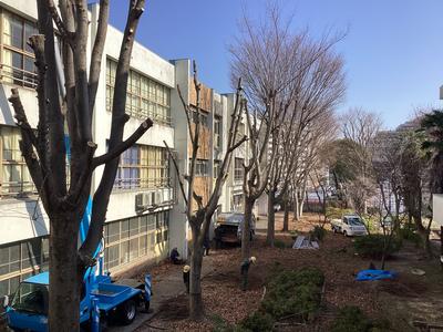 枝伸び放題、落ち葉落ち放題だった欅の木がバッサリ!