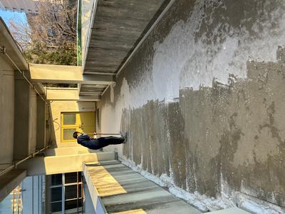 校内では、渡り廊下に積もった雪をI先生がお掃除。