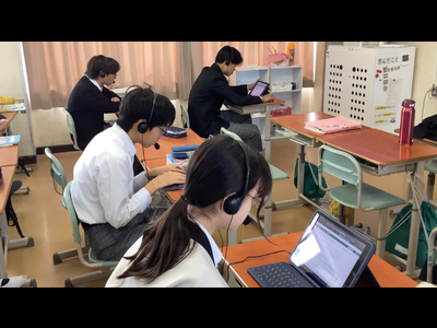 ヘッドセットを付けて、「書くこと」「話すこと」問題を実施。