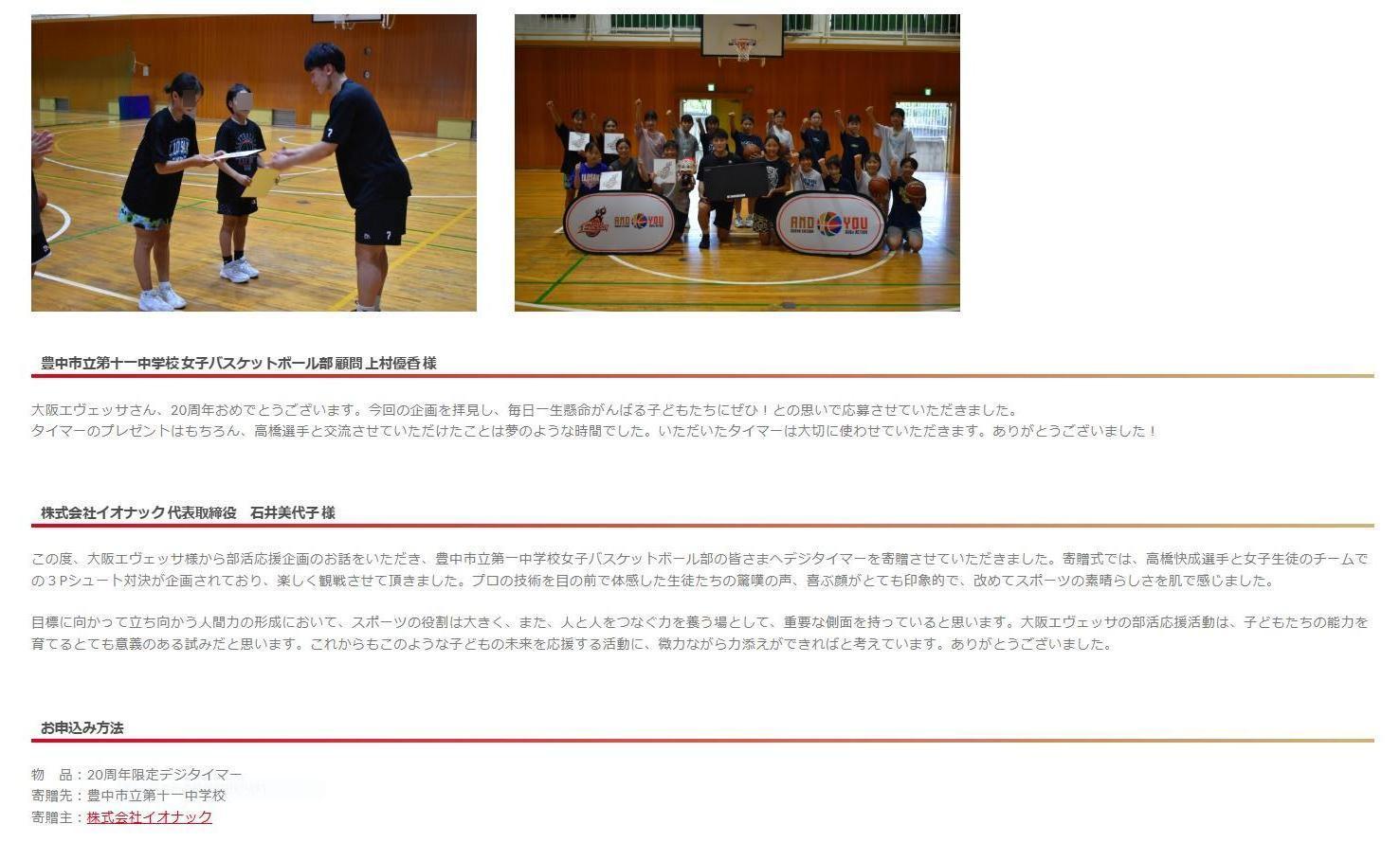 大阪エヴェッサさん、20周年おめでとうございます。今回の企画を拝見し、毎日一生懸命がんばる子どもたちにぜひ!との思いで応募させていただきました。