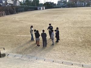 体験授業が終わり帰ってくる小学生をどう集合させるかを、執行部チームと久森先生が打合せ中。