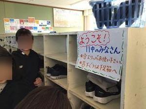 「ようこそ」案内が。嬉しいお出迎え。少路小の先生、ありがとうございます。