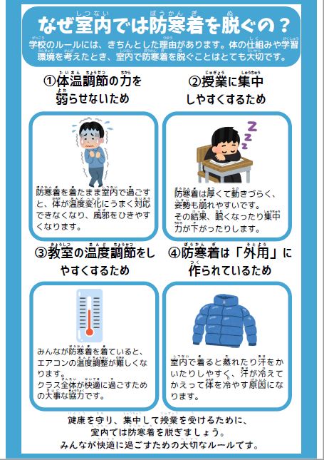 教室内では、防寒着を脱ぎましょう。