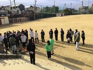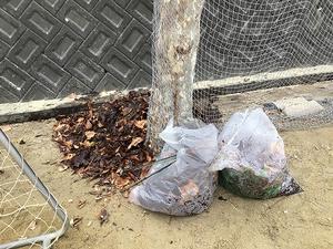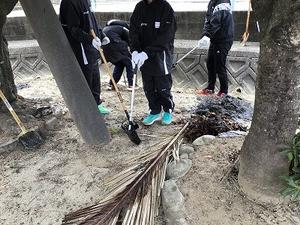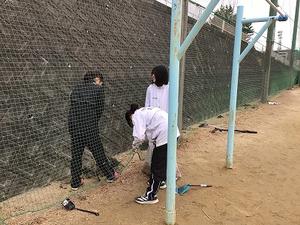 グランドでは落ち葉を集めて袋につめる陸上部員たち。