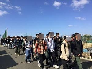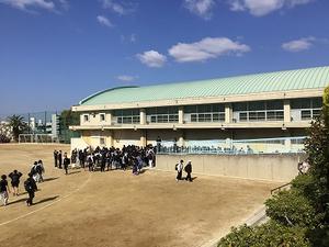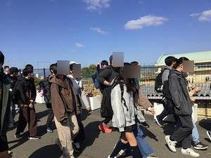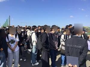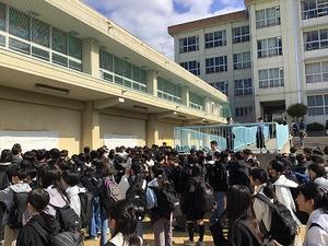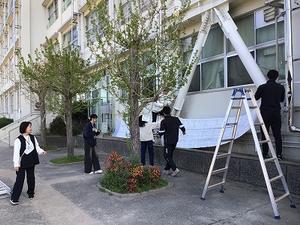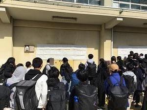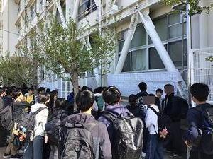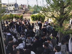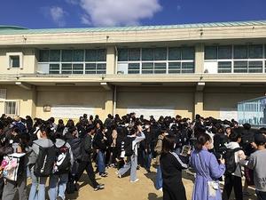 貼り終わるのを今や今やと待ちかまえる生徒たち。