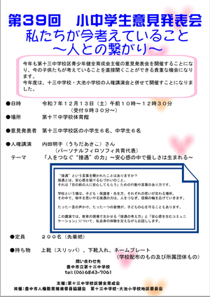 例年開催されている、第十三中学校青少年健全育成会主催「小中学生意見発表会」を令和7年(2025年)12月13日(土)10:00~第十三中体育館にて開催いたします。