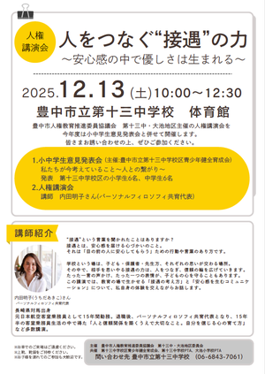 今年度は、例年意見発表会のプログラムとして行っている講演会を豊中市人権教育推進委員協議会 第十三中・大池地区委員会主催の「人権講演会」として開催することとしました。