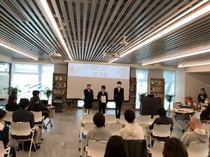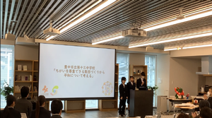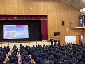 修了式で、先日3月15日大阪大学中之島センターにて開催された、『いのちジュニアEXPOコンクール』で2年生3名が本校が取り組んでいる人権学習を『違いを尊重できる集団づくりから平和を考える』というテーマで発表しました。その発表内容等を修了式で報告しました。