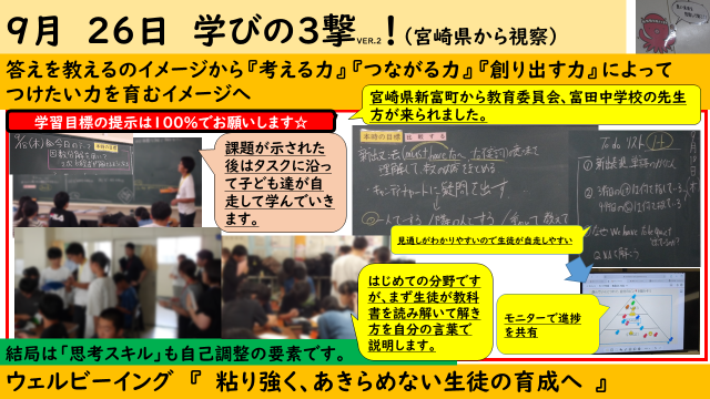 ということでしたので、3年生の数学の授業と2年生の英語の授業で本校が今進めている『自己調整のある学び』