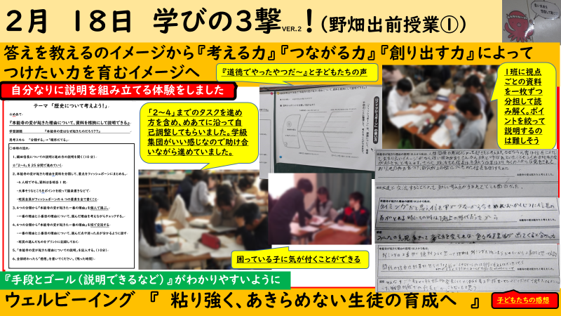 行いました。感想をみると、多くの子供たちが「なぜ、起きたのか資料を根拠に自分の説明(考え)を組み立てたようでした」