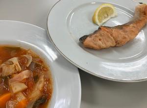 3時間目あたりからニンニクの良い香りが廊下に立ち込めていて期待して試食にのぞみました。ミネストローネはセロリの香りが良く、いくらでも食べられそうでした。鮭のムニエルは薄衣で、外側がカリッと仕上がって、皮まで美味しくいただきました。レモンは十五中のビオトープ池の周りの畑で採れたもので、さわやかに魚の味を引き立てていました。