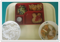ごはん・のっぺい汁・うさぎ型ハンバーグのケチャップかけ・ツナと小松菜のサラダ・切干大根の煮物・お月見団子
