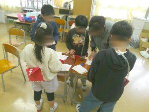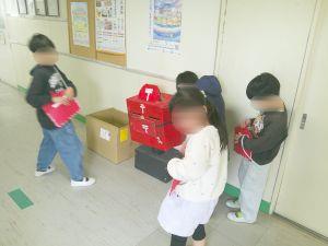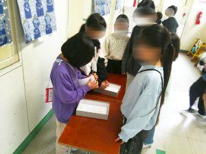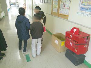 休み時間、郵便マークのかばんを持った郵便局員たち(2年生)がはがきを回収に来ます。