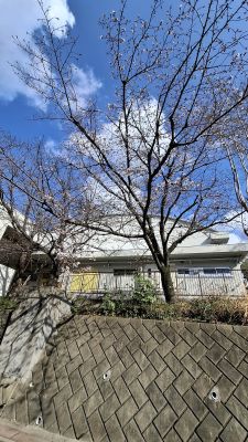 体育館の前にある桜が咲き始めました。北緑丘小学校で最初に咲き出すところです。