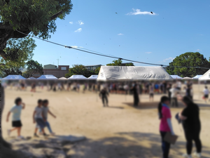 青い空に、数日前から張られている白いテントの屋根がとてもきれいでした。
