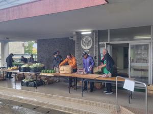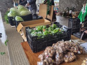 例年すぐに売り切れてしまう採りたての野菜を買いに、雨の中、朝から買いに来られる地域の方々もみられました。