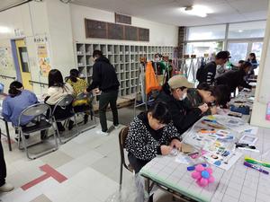 PTAブースでは、厚生委員会が企画した、夏祭りで廃棄されたラムネのビー玉や、紙皿、アルミホイルなどを使った工作が企画され、子どもたちが思い思い、素敵な作品を作っていました。