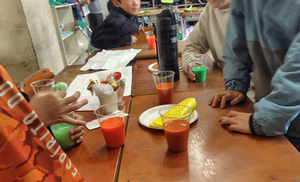 4年生が企画したカフェ。ジュースの材料は水と絵の具、パフェやクレープもありました。みんな小さい時、こんな遊びをやっていましたよね。企画した4年生も、小さかったころが少し懐かしくなったのでは?