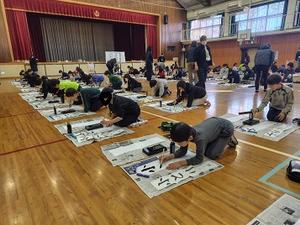 学級閉鎖で参加できなかった1クラスを除いた3クラスの子どもたちが習字道具を持って体育館にあつまりました。