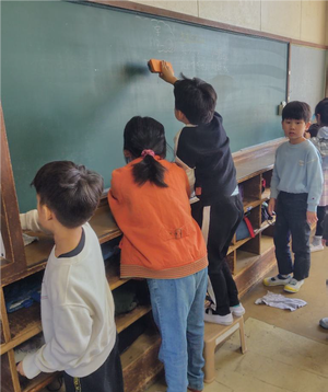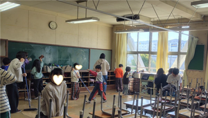 二年生のクラスでは、みんなで並んで雑巾がけ、窓の桟を拭いたり、黒板をきれいに消したり、自分たちのできることを一生懸命やっていました。手の届かないところも、ちょっと箒のとり合いなどもあったけど、教えてあげたら素直にやるとってもいい子たちだなと思いました。
