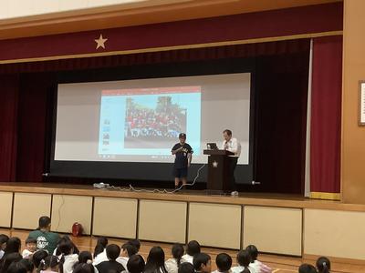 10月の全校集会では、豊中親善少年野球団として姉妹都市・サンマテオ市(アメリカ合衆国カリフォルニア州)を訪問した6年のYくんが貴重な経験を全校のみんなに報告してくれました。