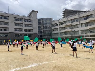 フラッグの色は、1組は青色、2組は緑色、3組は赤色、4組は黄色。4色のフラッグが魅せる美しさと5年生のキレのある動きを、少しずつみんなでつくり上げていってほしいと思っています。