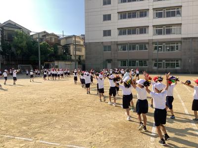 校長室から運動会の練習風景が見えてきます。1年生が団体演技のダンスの練習をしていました。