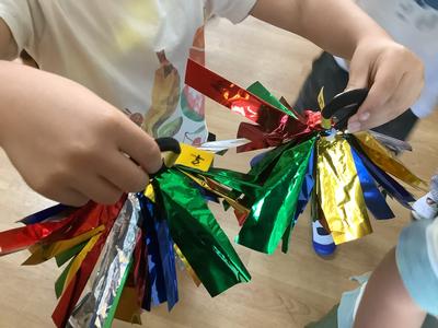 「いけ!いけ!ぴっかぴか」のダンスを踊っている姿を図工で表現したのですね。1年生がチアポンポンを「見て!見て!」と子どもたちが寄って来て見せてくれました。団体演技は、子どもたちの手元にも注目して観てください!