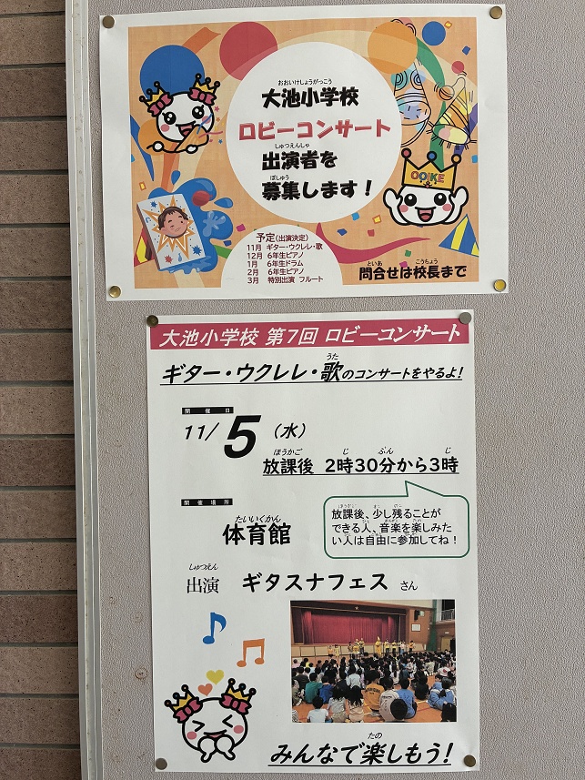 第7回大池小学校ロビーコンサートを開催します!【 出演者:ギタスナフェスさん 日時:11月5日(水)放課後14時30分~15時 自由参加】