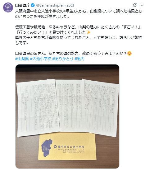 各都道府県庁から温かいお手紙が届いており驚いています。山梨県庁公式Xに本校の取組みが掲載されました。本当にありがとうございます