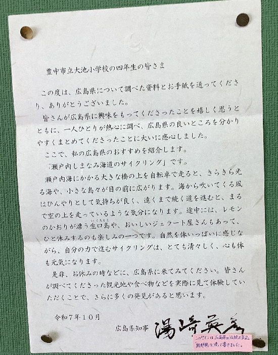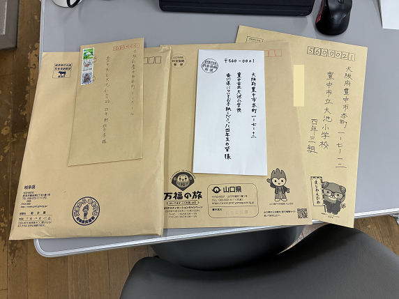 本校の4年生が社会科や総合学習で都道府県について調べ、国語の手紙の学習と合わせ、学んだことを手紙に書き、各都道府県知事にお手紙を送りました。大変お忙しい中なので読んでいただけるだけでよかったのですが、本校にお礼の手紙等が届いています。大変恐縮しております。