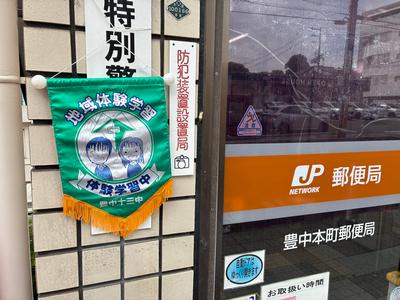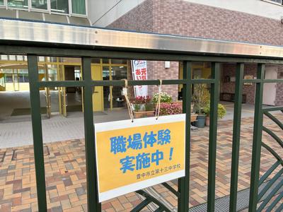 大池小学校の卒業生が地域の中で頑張っています。第十三中学校の「職場体験学習 実施中!」の旗や看板を見られたら、温かく見守っていただけると有難いです。
