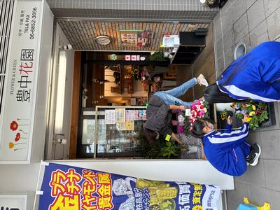 豊中駅前の銀座商店街では、お花屋さんで職場体験を行っている十三中生を発見! お店の方があたたかく丁寧に指導されており、それを受けて一生懸命に取り組んでいる生徒さんの姿が素敵でした。