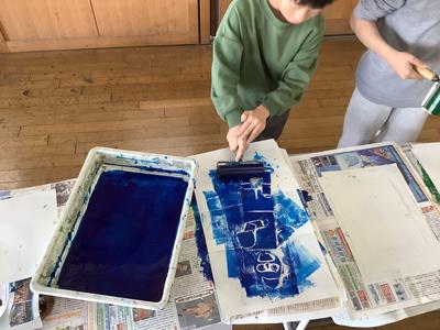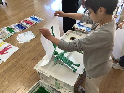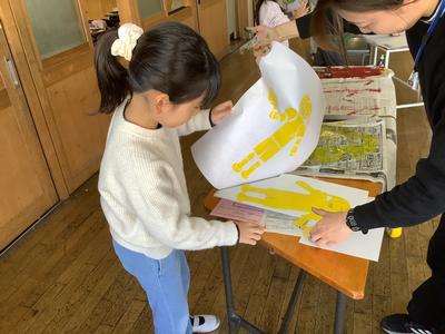 3年生の図工は紙版画の制作です。「運動するわたし」をテーマに制作を進めています。動きのあるポーズや体の向きを工夫し、運動中の躍動感が伝わるように形の重ね方や配置にこだわっていました。版画の魅力は、刷り上がったときに版と紙をはがす時の感触。それまでコツコツと地道に取り組んできたことが、一気に目の前に表れてくる瞬間等があると思います。子どもたちは、そんな版画の魅力や完成の喜びを感じているようでした。