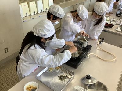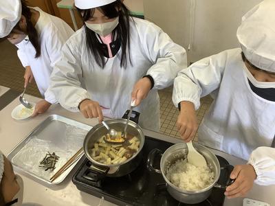 5年生は、家庭科でご飯と味噌汁の調理実習を行いました。米と水の量、火加減を考えて鍋でご飯を炊きました。また、味噌汁は煮干しで出汁をとり、大根、さつまいも、油揚げなどや味噌を入れるタイミングを考えて調理しました。