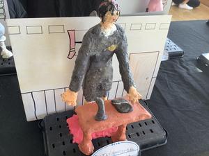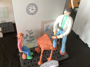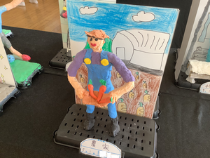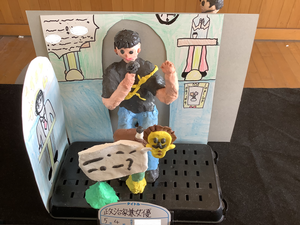 さて、5年生の作品テーマは「未来のわたし」(立体)です。「1年後、私は百人一首をがんんばる!」「10年後、私はサッカー選手になる!」のように近い未来、もしくは、将来の夢を粘土で表現しました。人だけでなく、小物や背景等も工夫しているので、ぜひ細かいところまでご覧ください。