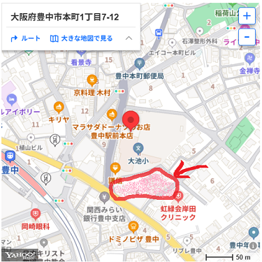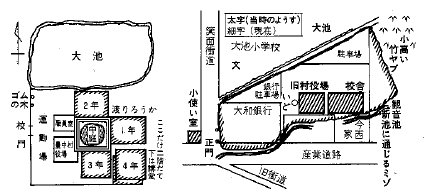 ☝克明尋常小学校の敷地(※大和銀行は、現・りそな銀行 豊中支店。産業道路は、現・国道176号線)