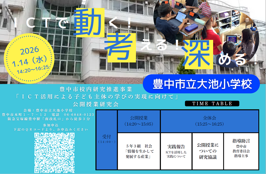 豊中市校内研究推進事業「ICT活用による子ども主体の学びの実現に向けて」授業公開・実践発表のお知らせ(一次案内)