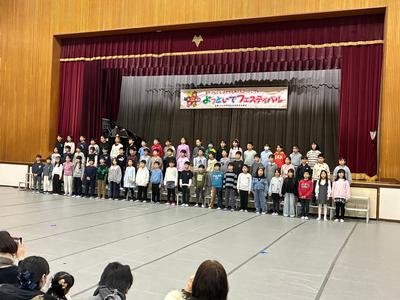 4年生有志で「津軽海峡・冬景色」(うた:石川さゆり/作詞 阿久悠/作曲 三木たかし)と「ふるさと」(うた 嵐/作詞 小山薫堂/作曲 youth case)の合唱を聴いていただきました。歌詞に「ひとりひとりの笑顔が いま 僕のそばに」「巡りあいたい人がそこにいる やさしさ広げて待っている」とあるように、第十三中学校区の皆さんとのつながりを思い浮かべながら歌いました。全員が心をひとつにして美しいハーモニーを響かせました。