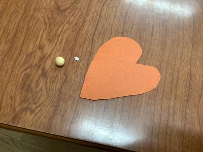 養護教諭が子どもたちに問いかけます。「受精卵の大きさはどれでしょうか? ハート? 大豆? 米粒?」「正解は、ハートの中にコンパスであけた穴の大きさ。受精卵は約0.13mmの大きさです。」子どもたちは、それを聞いてとても驚いていました。