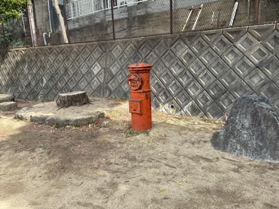 大池小学校の校庭の南側には、昭和レトロな赤い丸型ポストが設置されています。