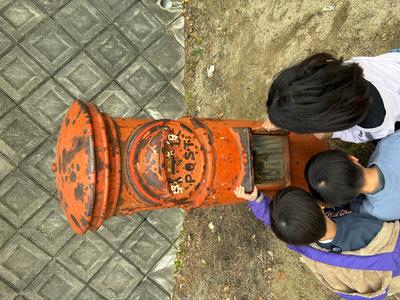 ふたが開くようになった郵便ポストを見ていると、校庭開放で遊んでいる子どもたちがたくさん寄ってきました。子どもたちもポストのことが気になるようです。