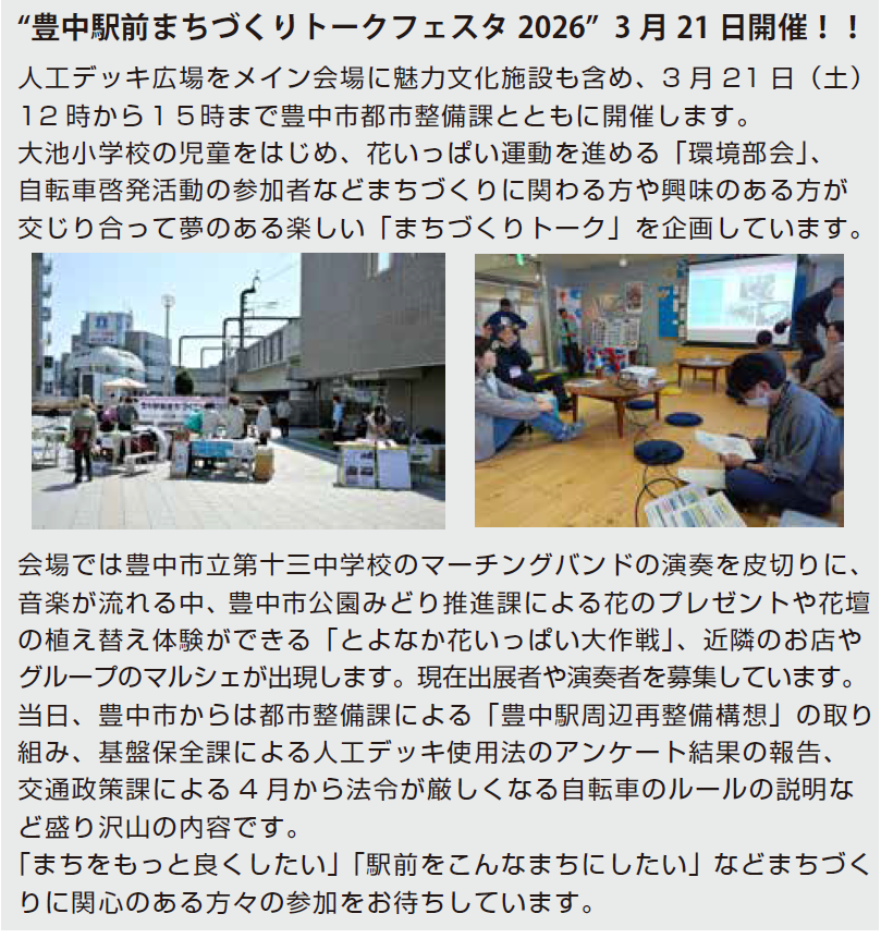 【案内】「豊中駅前まちづくりトークフェスタ2026」が3月21日に開催されます!