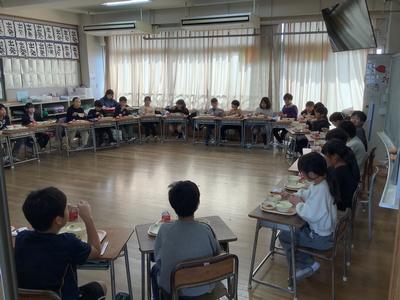 クラスのみんなで円になって給食を食べました(4年)