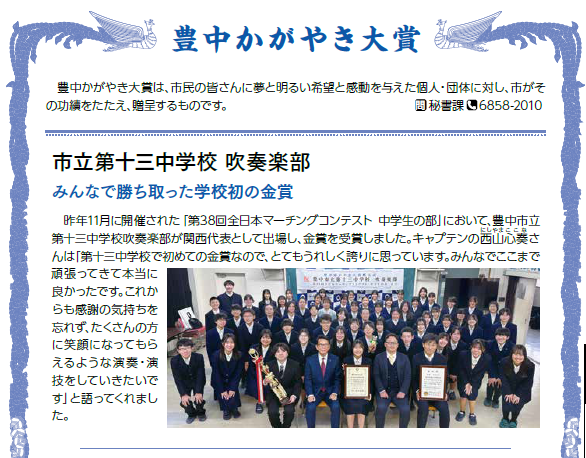 令和7年(2025年)11月22日に大阪城ホールで開催された「第38回全日本マーチングコンテスト 中学生の部」において、豊中市立第十三中学校吹奏楽部が関西代表として出場し、金賞を受賞しました。この快挙を賞して、長内繁樹豊中市長から「豊中かがやき大賞」が贈られました。