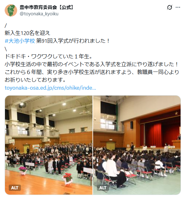 豊中市教育委員会公式Xに大池小学校が紹介されました!【第91回入学式】