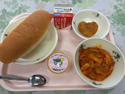記念すべき初めての給食メニューは、コッペパン、ハートコロッケ、米粉マカロニナポリタン、みかんゼリー、牛乳でした。