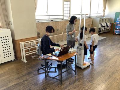 2年生が教室前のワークスペースで二測定を行っていました。今年度より新しい身長体重計を導入いたしました。教職員の校務パソコンと連動することができます。先生たちの事務作業が減ってほしいと思っています。